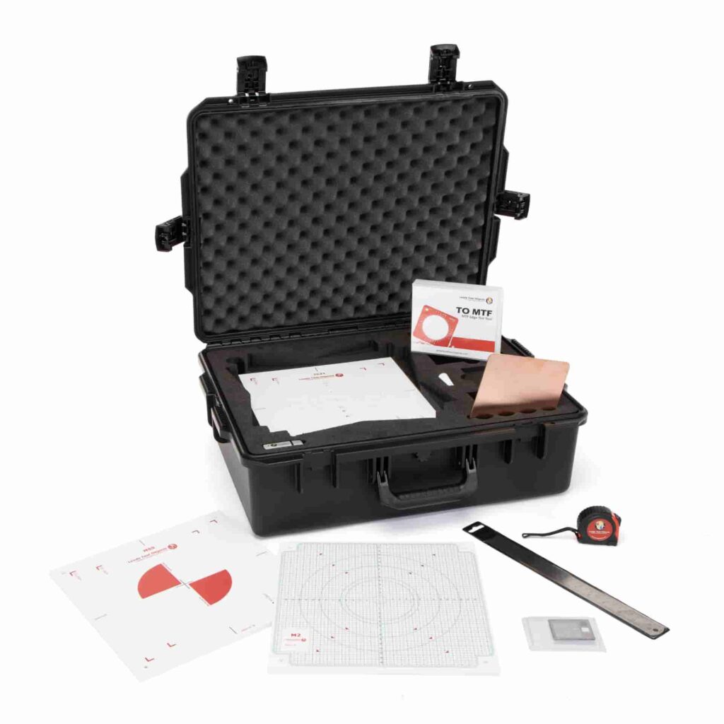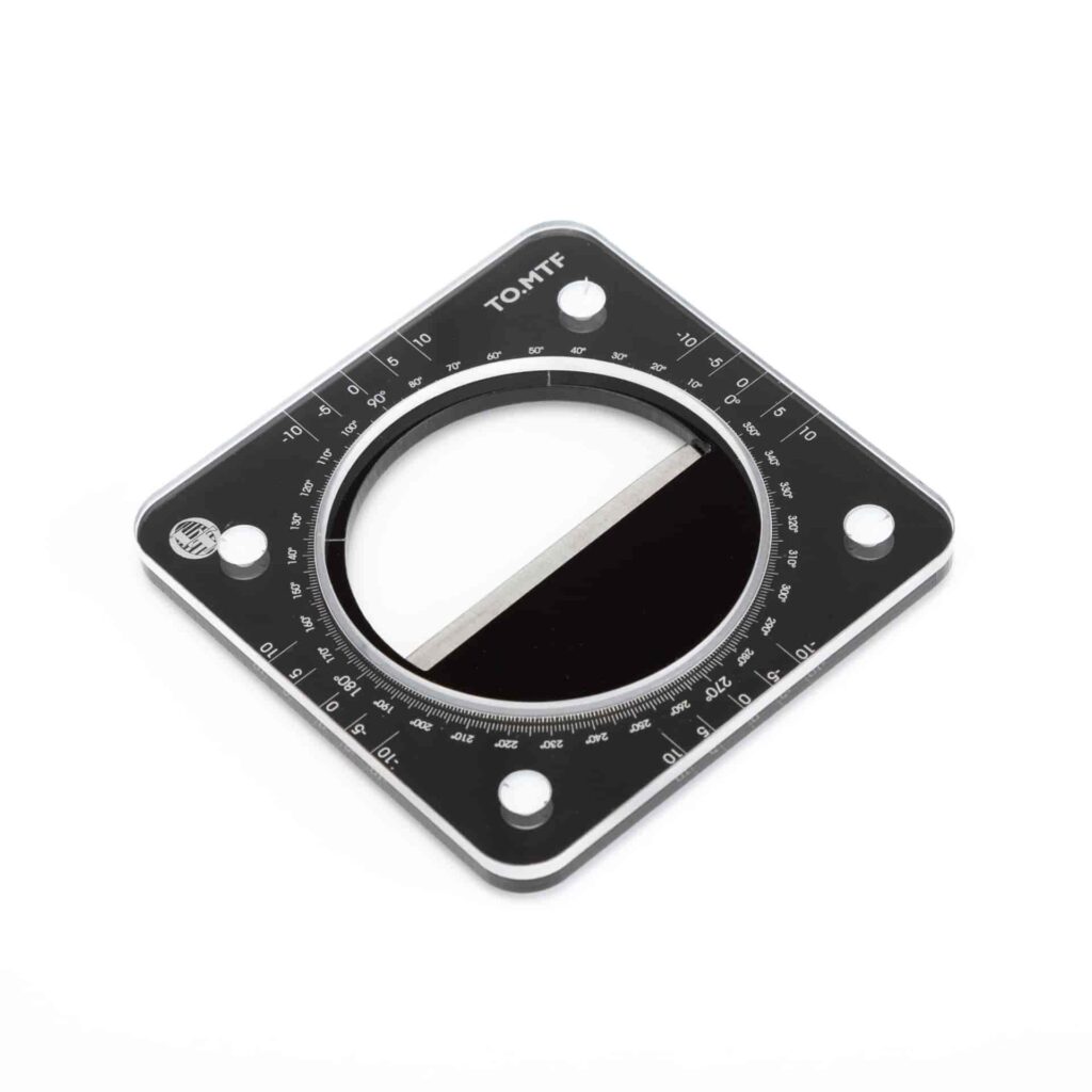 Un dispositif de test MTF Edge, équipé d’une roue d’angulation et d’un bord en tungstène.